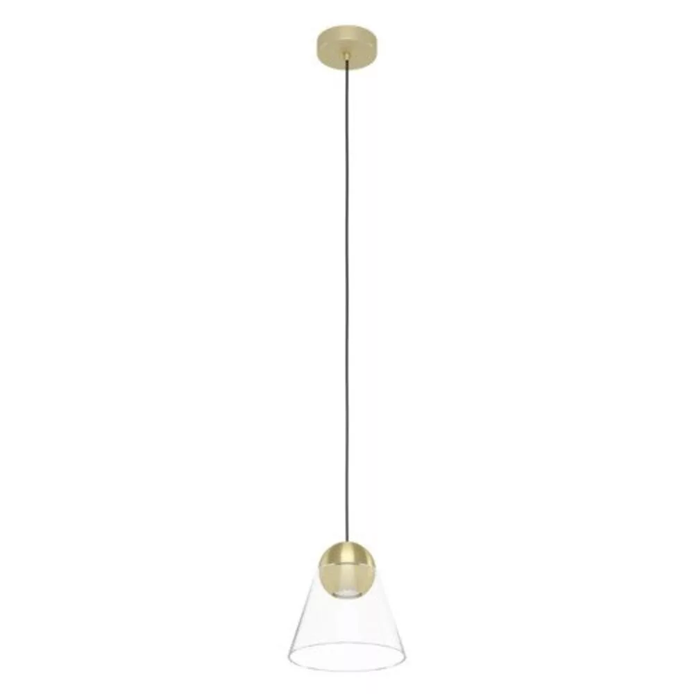 The CERASELLA LED pendant lamp is known for its modern design and stylish appearance. The conical, transparent glass shade is combined with a ball made of polished brass, adding elegance to the space. The ceiling mounts harmonize with the shade, ensuring the lamp aligns with the latest trends. The product includes an LED light source that provides a pleasant, warm white light, creating the perfect illumination for any room. It has a GU10 lamp holder and requires one GU10 light source. The pendant is an ideal choice for the modern furnishings of a living room or dining area.