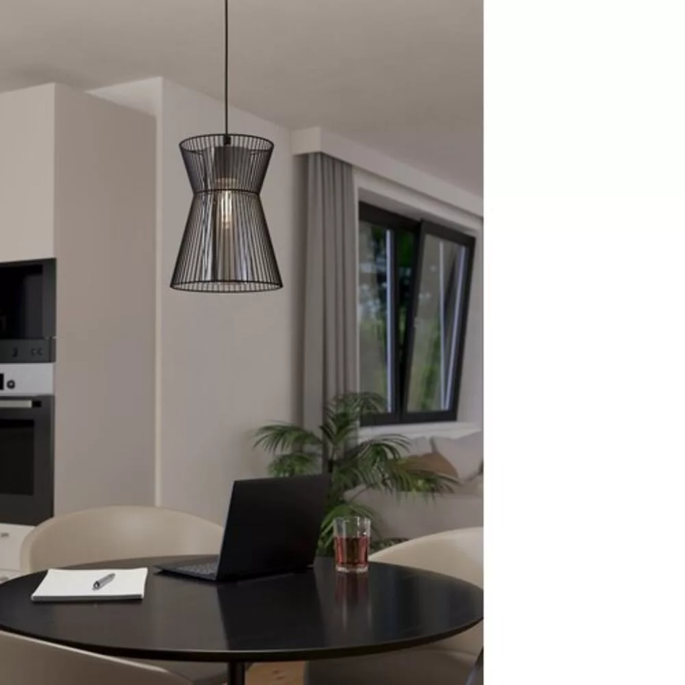 The MASETA pendant lamp features a glass shape with a black wire lampshade and contains an inner smoked glass cylinder. The wire shade creates a stunning play of light and shadow in the space. The harmonious combination of black and smoked glass perfectly fits modern interiors, creating the right ambiance for the living room or dining area. The lamp requires an E27 socket, but the light source is not included.