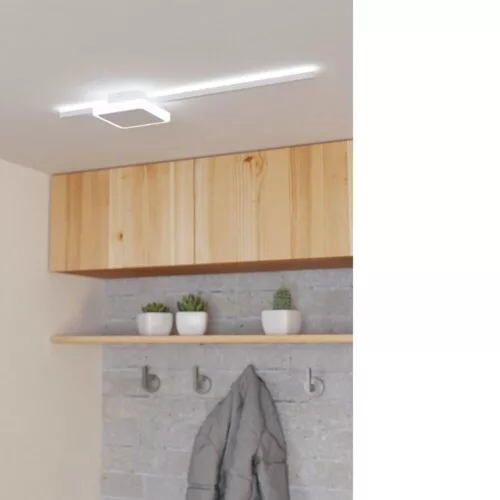 The SARGINTO LED ceiling lamp fits modern interiors, whether it's for the kitchen, living room, bedroom, hallway, or dining room. The lamp features a white metal LED profile and a square metal element connected to a plastic light panel. The integrated LEDs are hidden behind a silky plastic cover, providing a pleasant warm white light. With its lightweight design and elegant appearance, the lamp is a perfect choice for modern homes. It is important to note that the light source is included with the product.