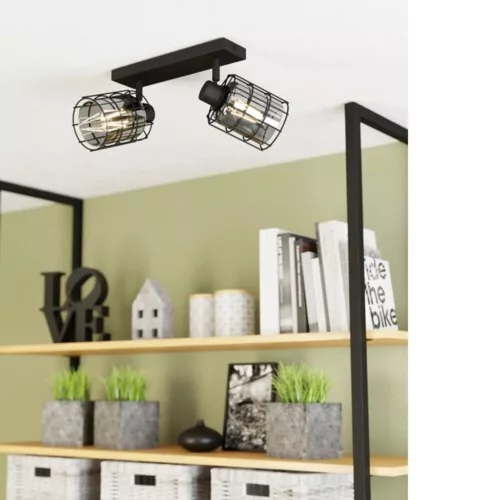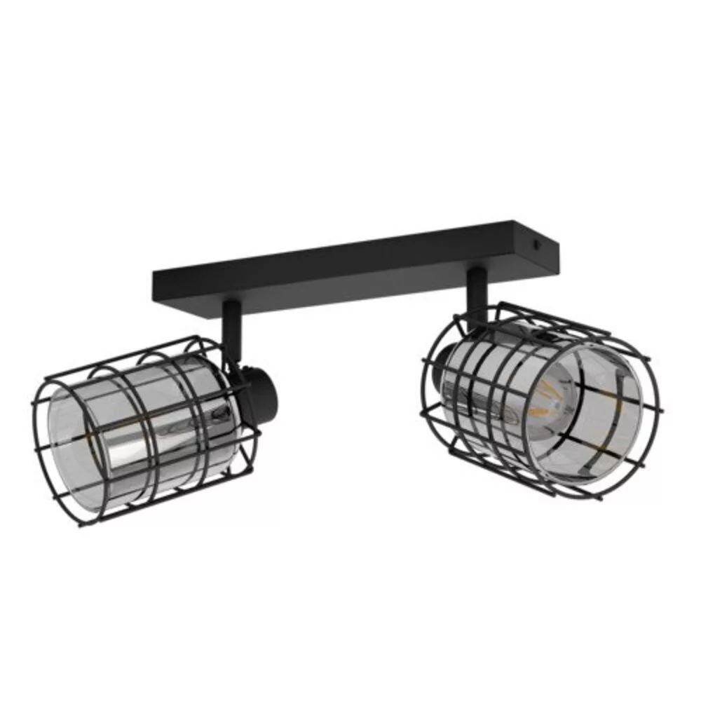 The CONSACA ceiling lamp features a black metal frame and two adjustable spotlights. Each lamp head is equipped with an inner, smoke-colored black glass cylinder surrounded by a black wire mesh frame, creating a unique play of light and shadow when the lamp is turned on. The ceiling spotlight perfectly fits modern interiors, and the adjustable lights allow for highlighting specific areas, whether it be in the kitchen, living room, bedroom, hallway, or dining room. The product requires 2 x E27 light sources, which are not included in the package. Energy efficiency is ensured by the IP20 protection rating and a 2-year warranty.