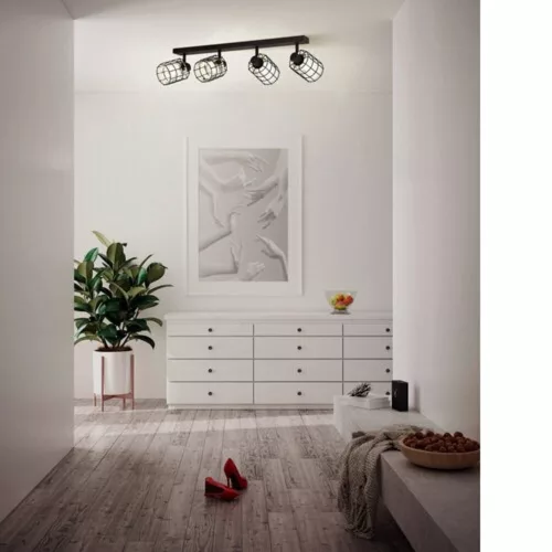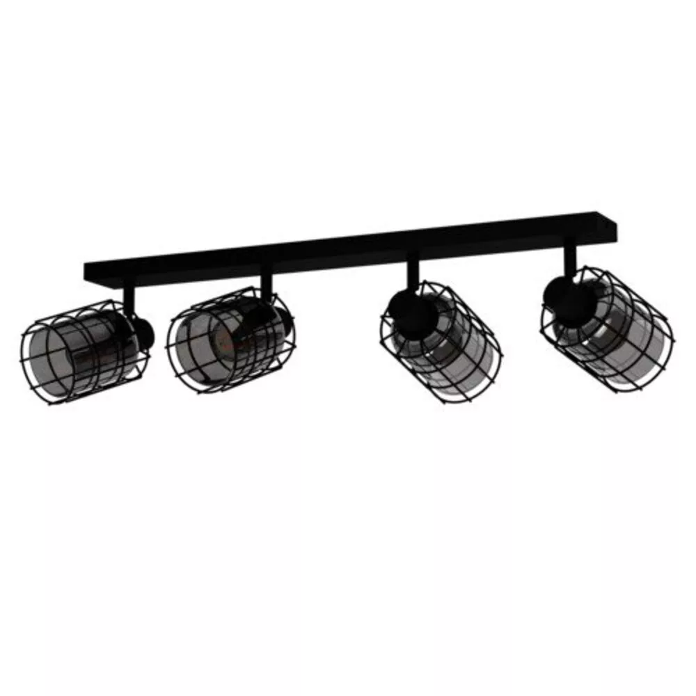 The CONSACA ceiling light features a black metal frame and four adjustable spotlights. Each lamp head includes an inner smoky glass cylinder surrounded by a black wire mesh, creating a stunning play of light and shadow when illuminated. This ceiling spotlight perfectly fits modern interiors. The adjustable lights allow you to highlight specific areas of the room, whether it's a kitchen, living room, bedroom, hallway, or dining room. The product requires 4 x E27 light sources, not included.