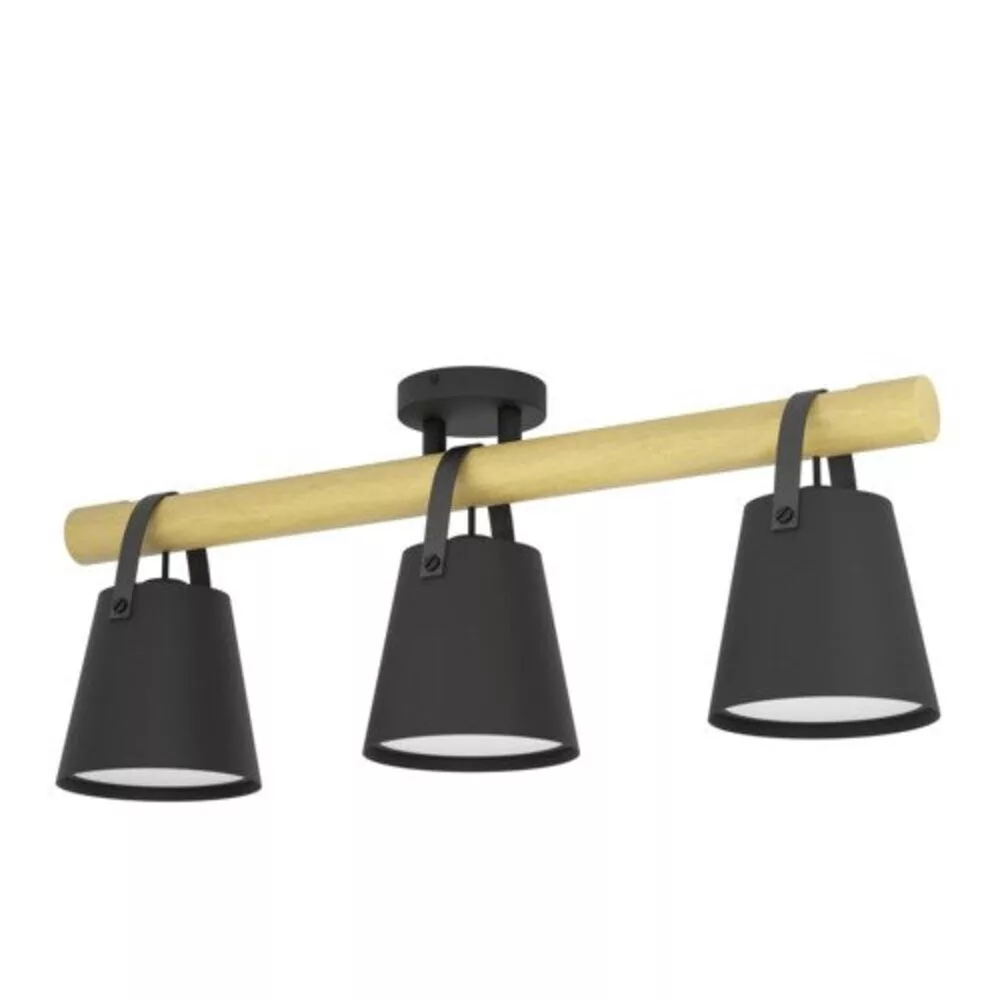 The BOYLE ceiling lamp, with its modern and stylish appearance, can be a perfect complement to any interior space. The black metal base features a cross fixture made of rubber wood, equipped with three metal shades secured by artificial black leather straps. The interior of the shades is coated in white, which further enhances the efficiency of the light, while the white plastic diffuser ensures even and pleasant illumination. The lamp is an ideal choice for the living room, bedroom, dining room, or hallway. The product requires 3 E27 light sources, which are not included in the package. With its elegant design and harmonious blend of different materials, the BOYLE ceiling lamp represents vintage style.