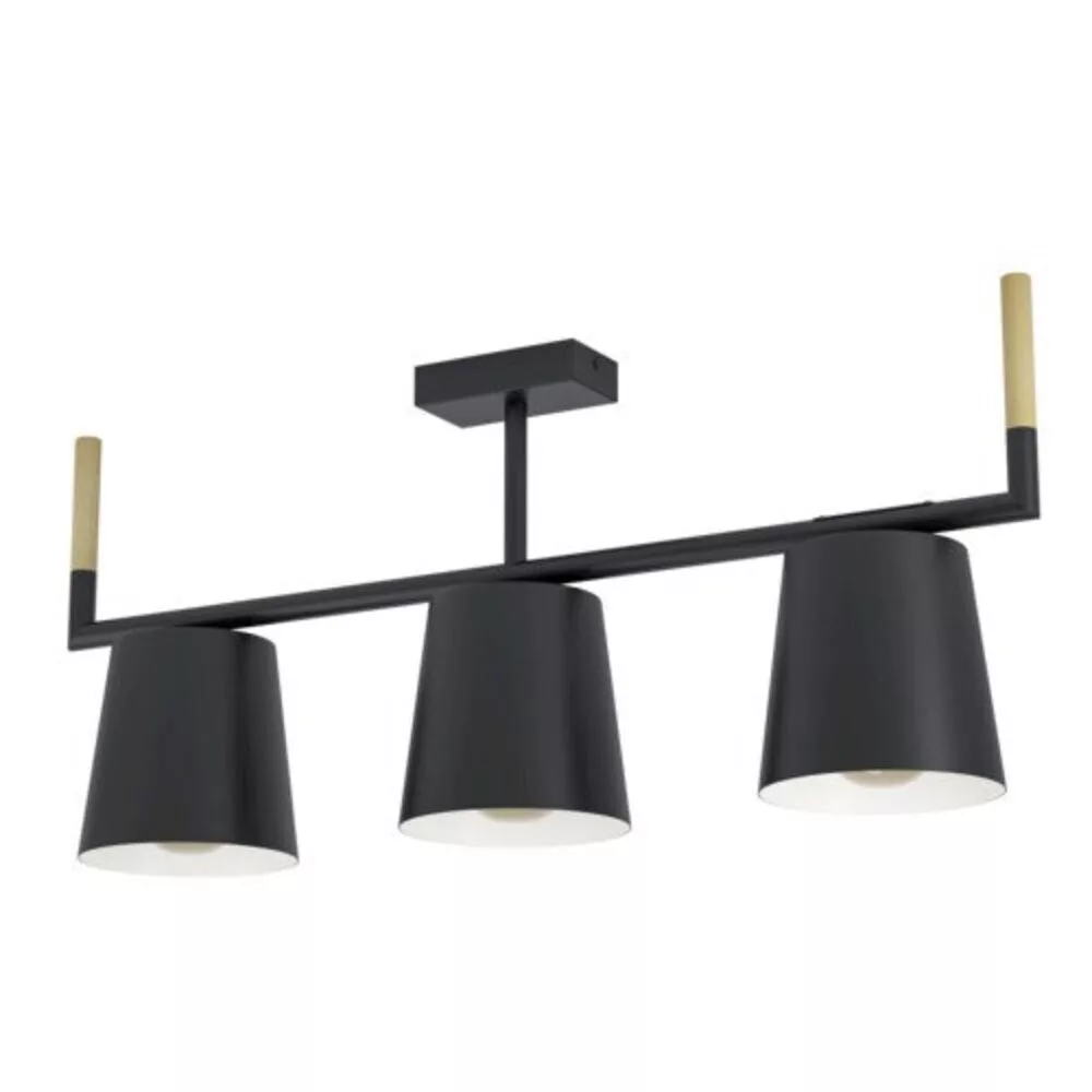 The LACEY ceiling lamp is a stylish focal point featuring a black metal base with a long U-shaped metal holder attached to decorative elements made of rubber wood. Three black metal shades are connected to the ceiling fixture, each with a cream-colored interior. Crafted in the spirit of Scandinavian new style, this lamp perfectly fits modern interiors, providing pleasant lighting in the kitchen, living room, bedroom, dining room, or hallway. The product does not include a light source and has an E27 socket that can accommodate a maximum performance of 3x40W.