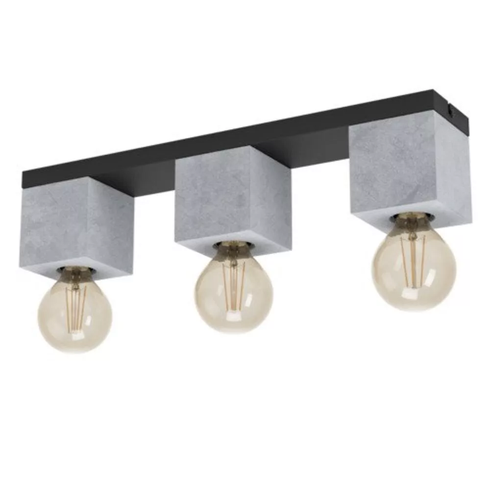 A PRESTWICK 3 ceiling lamp features three concrete lamp shades with a gray surface and a ceiling mount made of black metal. The minimalist design of the lamp is accentuated by the exposed bulbs, making it a perfect addition to modern interiors. It is an ideal solution for the living room, dining room, hallway, or bedroom. The smoke filament bulbs shown in the image are not included with the product. The lamp uses an E27 socket and accommodates three E27 light sources with a maximum power of 40W. It offers minimalist lighting and complements contemporary interiors.
