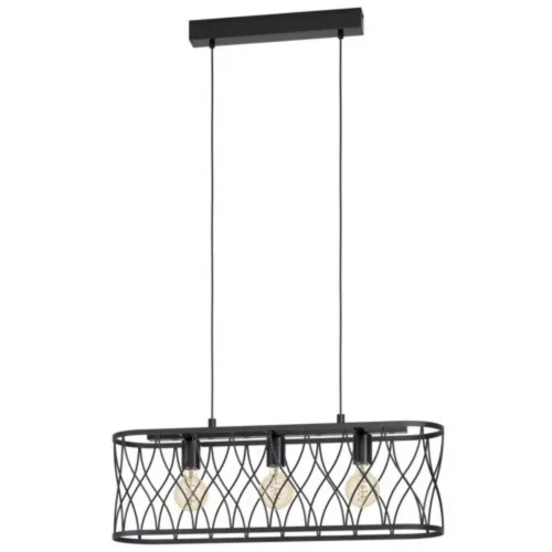 The GILTSPUR pendant lamp is an elegant, vintage-style product featuring an elliptical shade made of black wire. The dynamic design of the wire lattice work and the visibility of the three highlighted bulbs lend the lamp an impressive look. The wire shade and play of light create a charming atmosphere when the lamp is turned on. This pendant lamp fits modern interior design styles, making it an ideal choice for the living room or above the dining table. The product requires three E27 light sources, which are not included in the package.