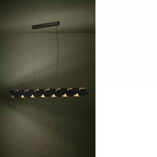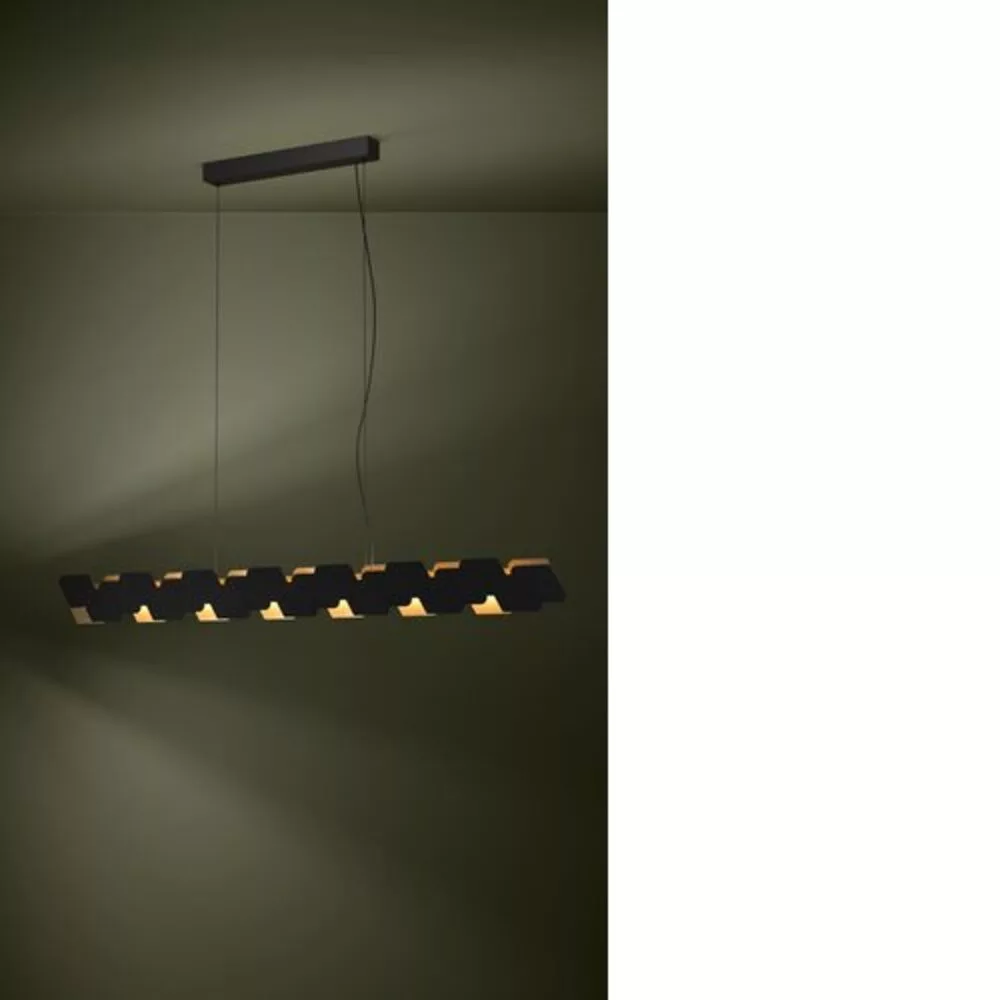 The ALTAGRACIA LED pendant boasts an elongated, suspended metallic body composed of flat gold and black elements arranged in an offset pattern. The integrated LEDs placed among the geometric metal pieces emit a pleasant, warm white light both upwards and downwards, and can be controlled by a harmoniously operating rotating dimmer. This pendant perfectly complements modern home lifestyles, creating a unique, eye-catching feature in the living room or above a long dining table. The product includes the light source, making it ready for immediate use.