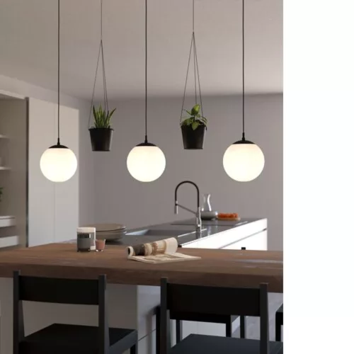 Discover the RONDO 3 indoor lamp, featuring an elegant black steel casing and a white opal glass shade. The lamp is designed with three E27 sockets, providing a maximum power of 3x40W. The product does not include a light source, giving you the freedom to choose a bulb that suits your needs. Thanks to its dimmable function, it allows you to adjust the brightness, creating any mood you desire. With an IP20 rating, this lamp is an ideal choice for any modern home interior. The RONDO 3 measures 1210 mm in length, 200 mm in width, and 1100 mm in height, perfectly adapting to the characteristics of the space. The product comes with a 5-year warranty, ensuring its long-term reliability.