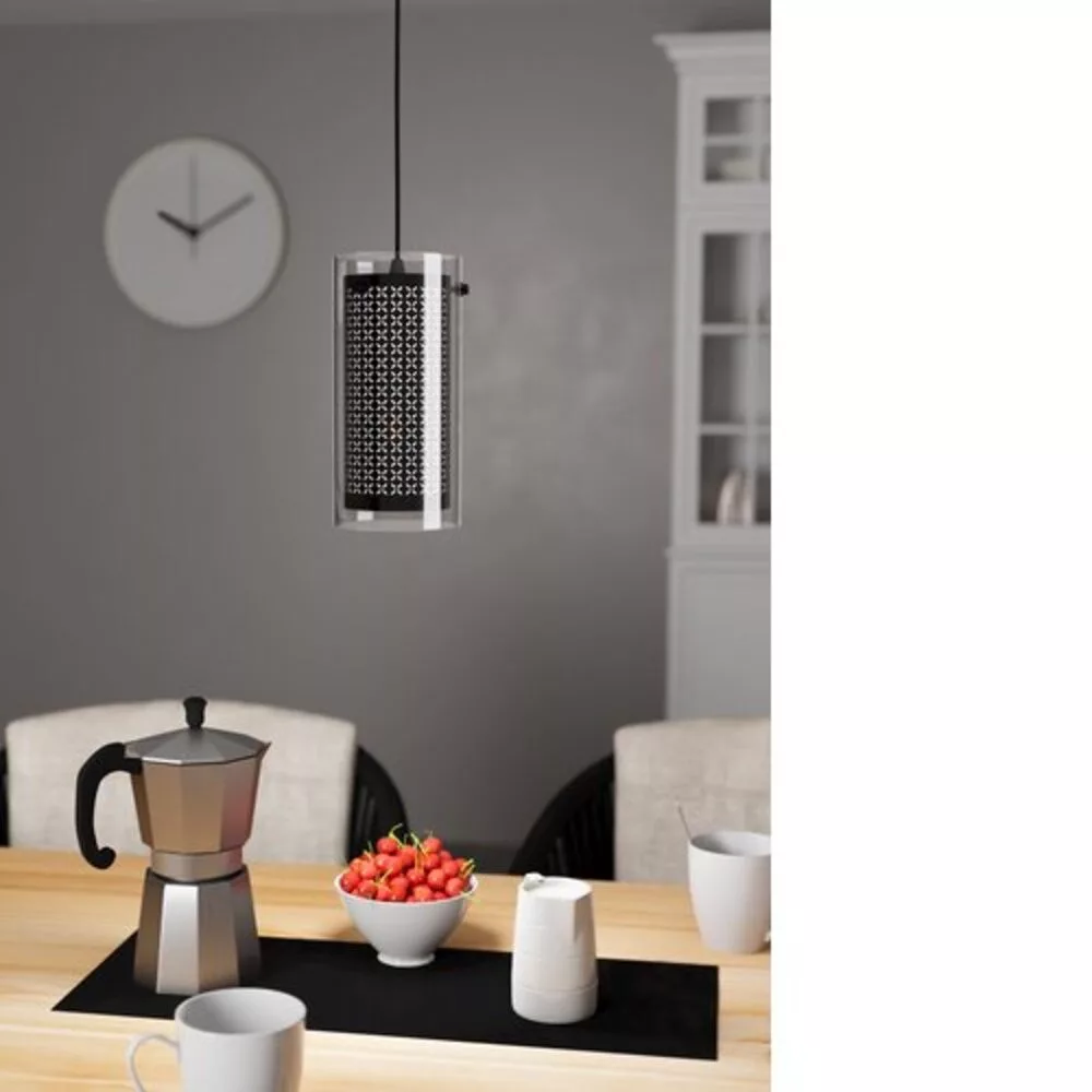 The PINTO TEXTIL 1 pendant lamp is an elegant and modern solution that perfectly fits any indoor style. The lamp has a glass cylindrical shade suspended by a black textile cord, giving it a sophisticated look. The patterned detailing of the inner black textile shade creates a stunning play of light and shadow when the lamp is turned on. The PINTO TEXTIL 1 is an ideal choice for the living room or dining area, providing attractive illumination.