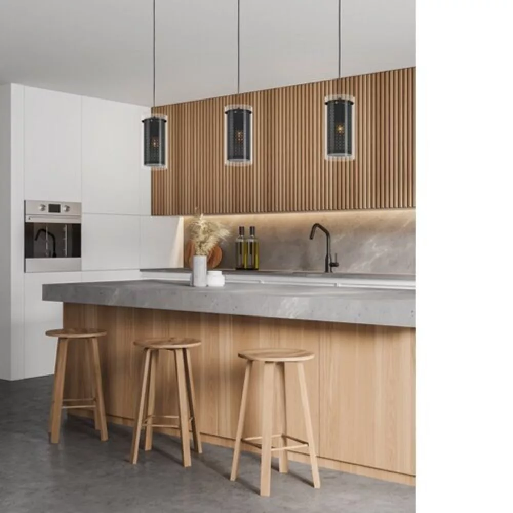 The PINTO TEXTIL 1 pendant lamp stands out in any interior with its modern and elegant appearance. Its three cylindrical glass lampshades hang from black textile cables from a metal ceiling canopy. The interior of the lamp is made of black fabric, featuring cut-out details that create a magical play of light and shadow when the lamp is turned on. The PINTO TEXTIL 1 pendant is an ideal choice for above the living room or a long dining table, providing appealing lighting. The product has an E27 socket, but the light source is not included. The lamp has a maximum power of 3x10W and is compatible with E27 LED light sources.
