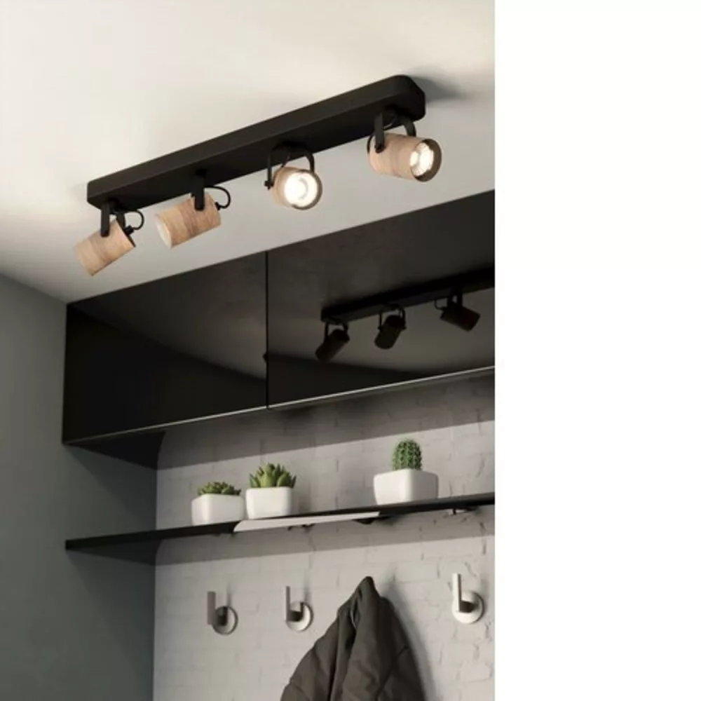 The EGLO CAYUCA spot lamp is an elegant and modern indoor solution that fits perfectly into any interior. The combination of a black steel casing and a brown wooden shade gives the lamp a clean appearance. The GU10 LED light source type ensures efficient and energy-saving lighting, with a maximum output of 4x3W, making it an ideal choice for both home and business environments.