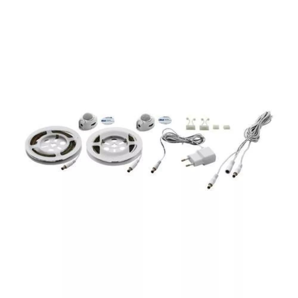 The PIDIO LED strip set is a practical solution for under-bed lighting, made of white plastic and equipped with a motion sensor. Each of the two sensors and two LED strip lengths is 120 cm, and they can be easily attached using the adhesive tape provided. The LED strips can be adjusted at designated points, allowing for easy shortening. The integrated LEDs emit a pleasant warm white light and provide automatic indirect lighting under the bed. This practical night light helps navigate a dark room. The LED strips can light up for up to 10 minutes but can also be set to a 30-second timer. The light source is included with the product. It comes with a guaranteed 5-year warranty and has an outstanding energy efficiency class.