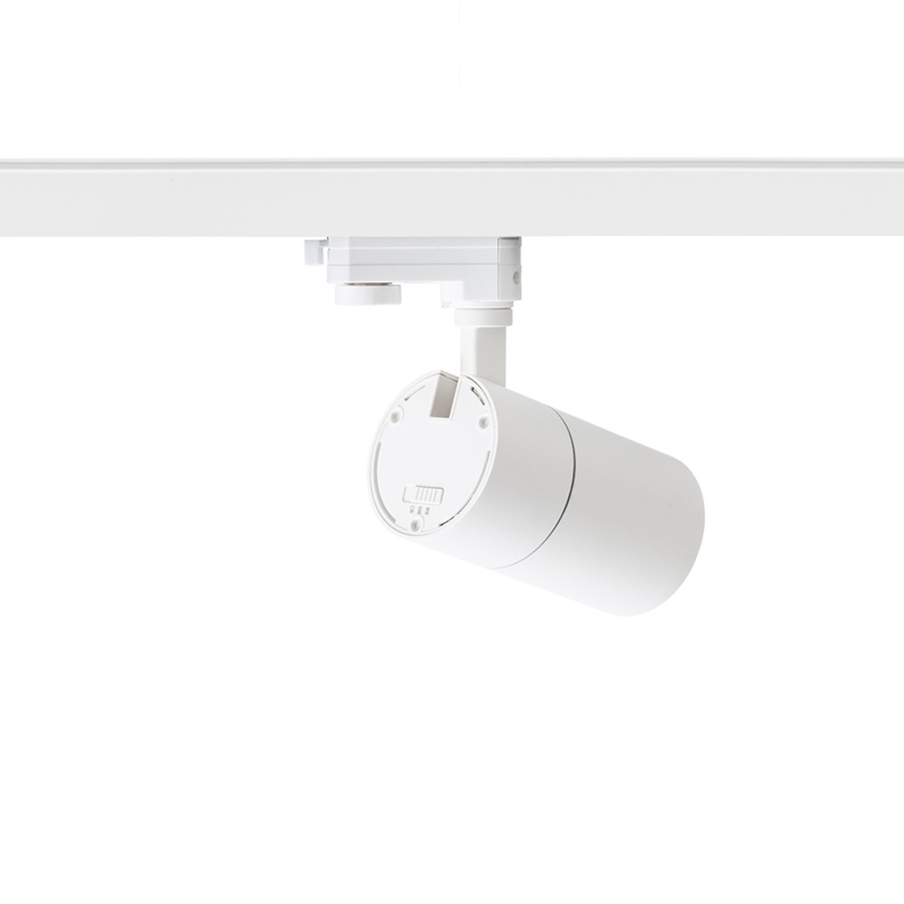 Dimmable, cylindrical lamp for three-circuit track, with adjustable light color: warm white (WW), neutral white (NW), cool white (CW). TRIAC dimming.