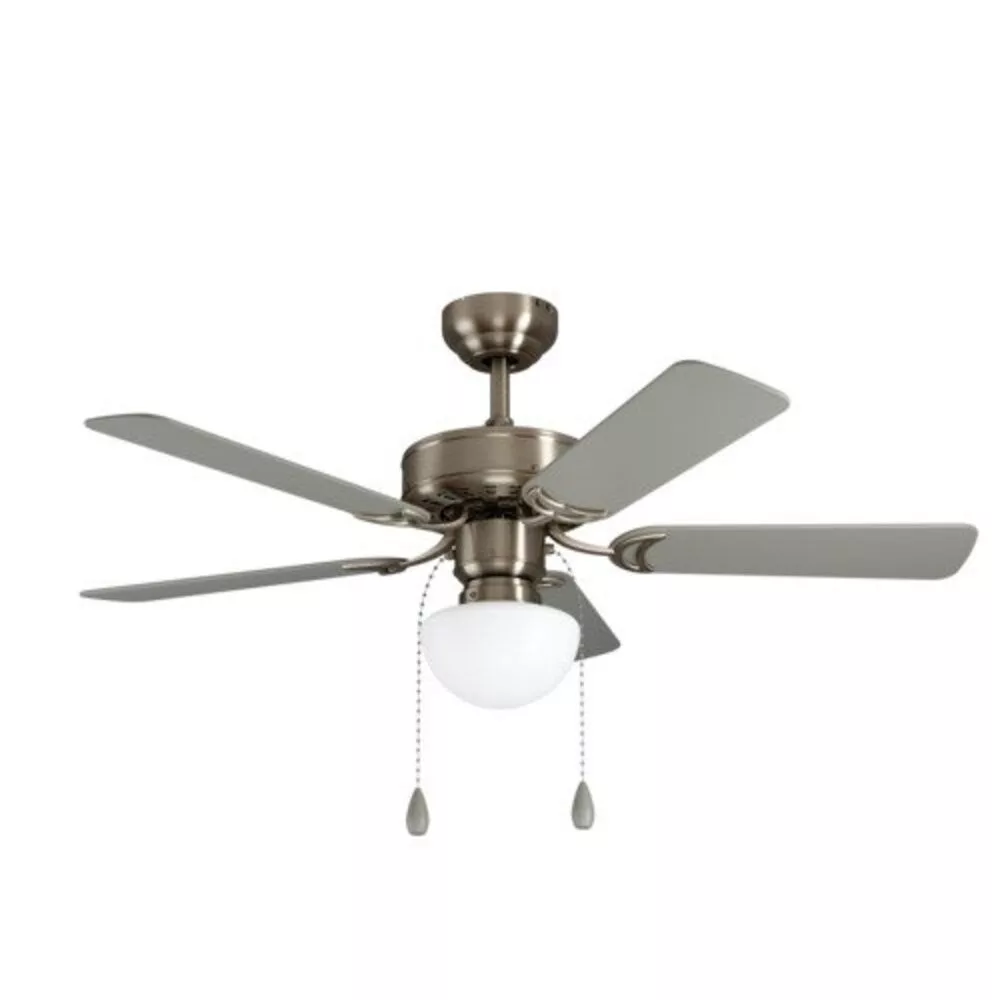 The CADIZ ceiling fan lamp, with its modern design and efficient operation, is an ideal choice for any indoor space. The lamp, made with a matte nickel-finished steel cover, features five MDF blades that can be rotated backward, allowing for the display of either the silver or oak-colored side. The lamp is equipped with a white-painted glass shade and can be turned on and off with a pull cord, as well as having a choice of three speed settings. A particularly practical feature is that the fan can be used in both winter and summer modes, helping to maintain a pleasant temperature in the room all year round. The product has an E27 socket and requires 1 E27 bulb, which is not included. The CADIZ is suitable for various uses and, with its diameter of 106.6 cm, is recommended for rooms of 13-20 m² and can even be installed on ceilings with a slope of up to 13°.