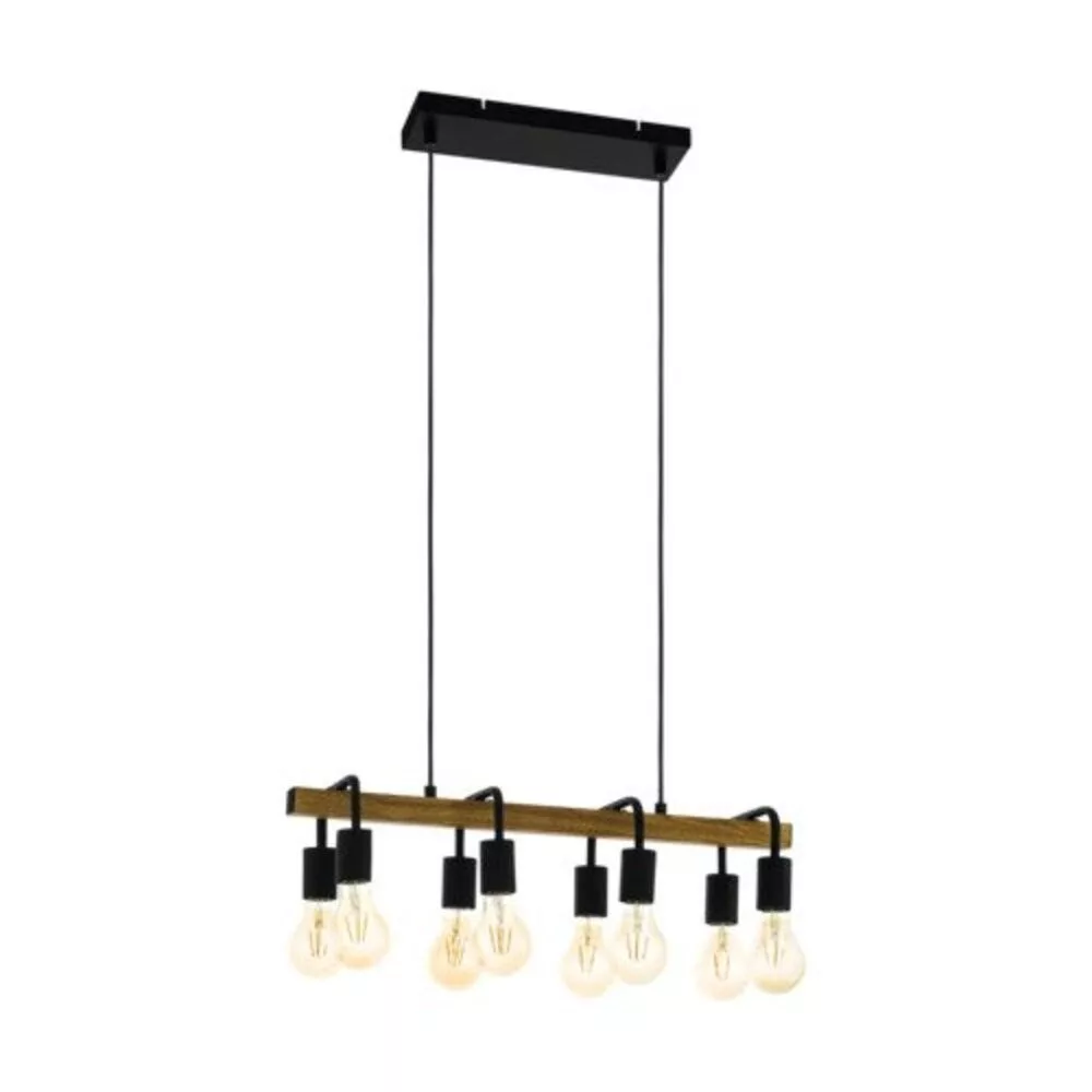 Az ERRIBERA függeszték lámpa fekete fém lámpafoglalatai formálisan lefelé hajlanak egy tölgy színű fa rúd felett. A fa és fém vonzó kombinációja tökéletesen passzol a vintage stílusú belső terekbe. Modern világítást biztosít bármely helyiségben, legyen szó a nappaliról vagy egy hosszú étkezőasztal felett. A lámpához tartozó fényforrások (filament izzók) nem találhatók a csomagban. A termék E27 lámpafoglalatokkal rendelkezik és 8 x E27 izzót igényel.
