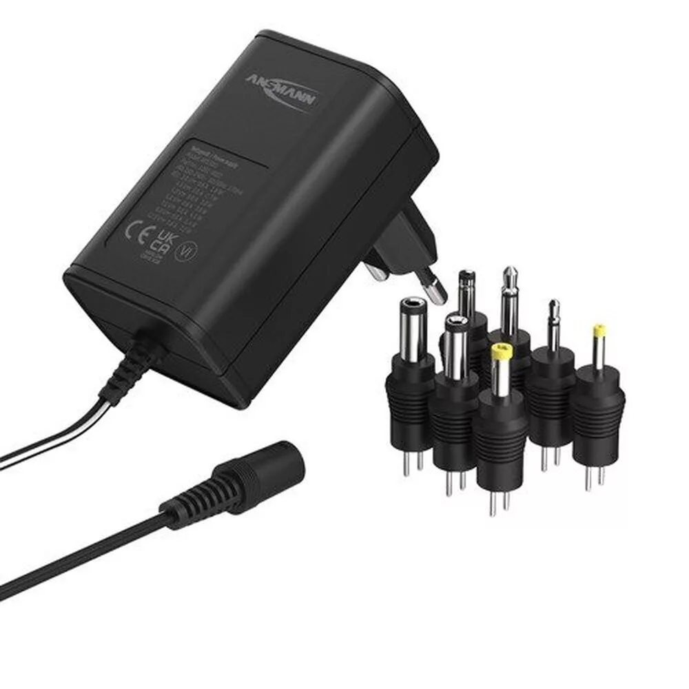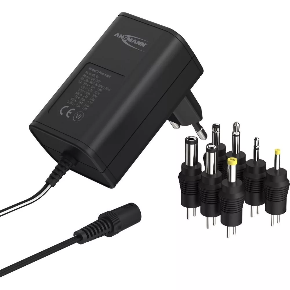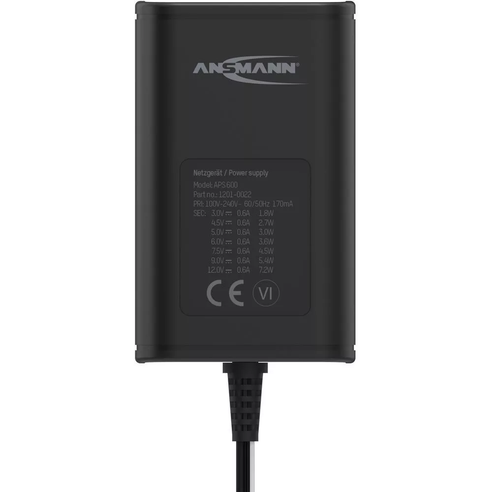 ANSMANN universal power supply APS 600 with a maximum power of 7.2 W and an adjustable charging current of max. 0.6 A at 3-12 V. The power supply is ErP compliant and voltage stabilised and can be used worldwide with an input voltage of 100 - 240 V AC. Incl. pole reversal coupling with different plug types: Jack plug: 2.5 x 12 / 3.5 x 15