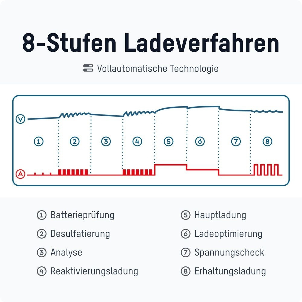 8-stage vehicle charger for 6V and 12V lead-acid, lead-gel and lead-mat batteries, as well as 12V LiFePO4 batteries