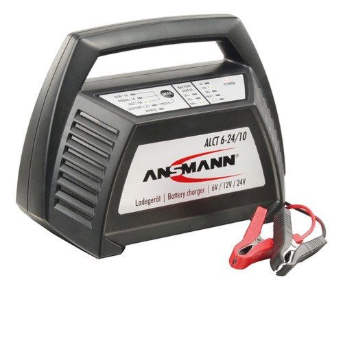 ANSMANN charger ALCT 6-24/10 for charging lead-acid, lead-gel and lead-fleece batteries from 4.5Ah with a voltage of 6-24 V and a max. charging current of 10 A; comprehensive safety for the battery. Charging current of 10 A; Comprehensive safety for the battery thanks to charging current control, overcharge protection, trickle charge, refresh mode for deeply discharged batteries, cold temp mode for complete charging even at temperatures below 5°C and short-circuit / reverse polarity protection; Ideal for wintering the batteries of motorbikes, motorboats, lawnmowers etc., Suitable for standby and parallel operation, also acts as an automatic jump-starting aid, 3-year warranty.